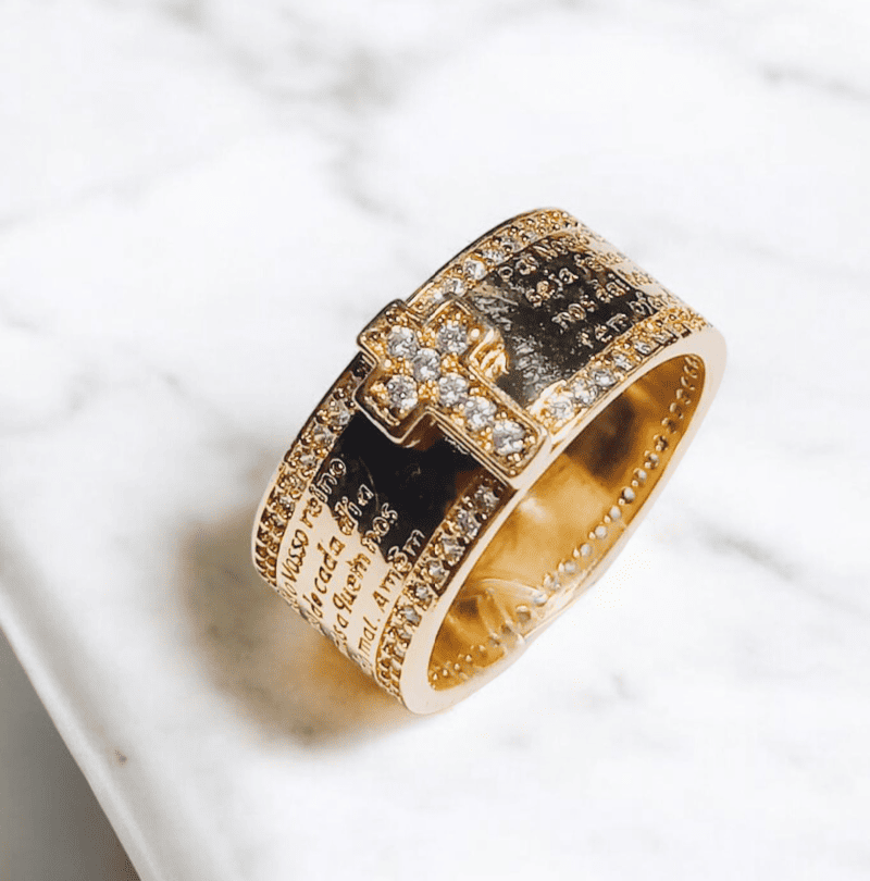 Anel religioso com zircônias folheado à ouro disponível no número 18