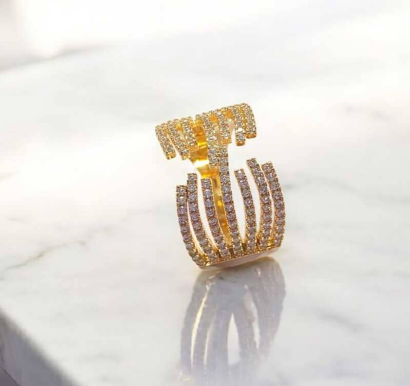 Realce a sua beleza com o Anel Zircônias Unidas Folheado a Ouro 18K. Uma peça que captura a luz e o olhar, ideal para quem ama sofisticação sem abrir mão do conforto.