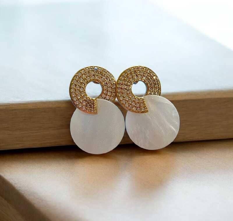 Que combinação de materiais elegante! O brinco de duas esferas, unindo a sofisticação da madrepérola com o brilho das zircônias, é uma peça clássica e luxuosa.