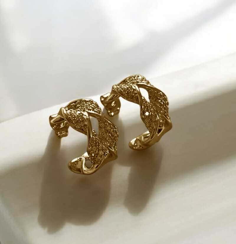 O brinco de “curvas” cravejado é um clássico da elegância, pois o formato orgânico e o brilho das zircônias criam um visual muito feminino e sofisticado.