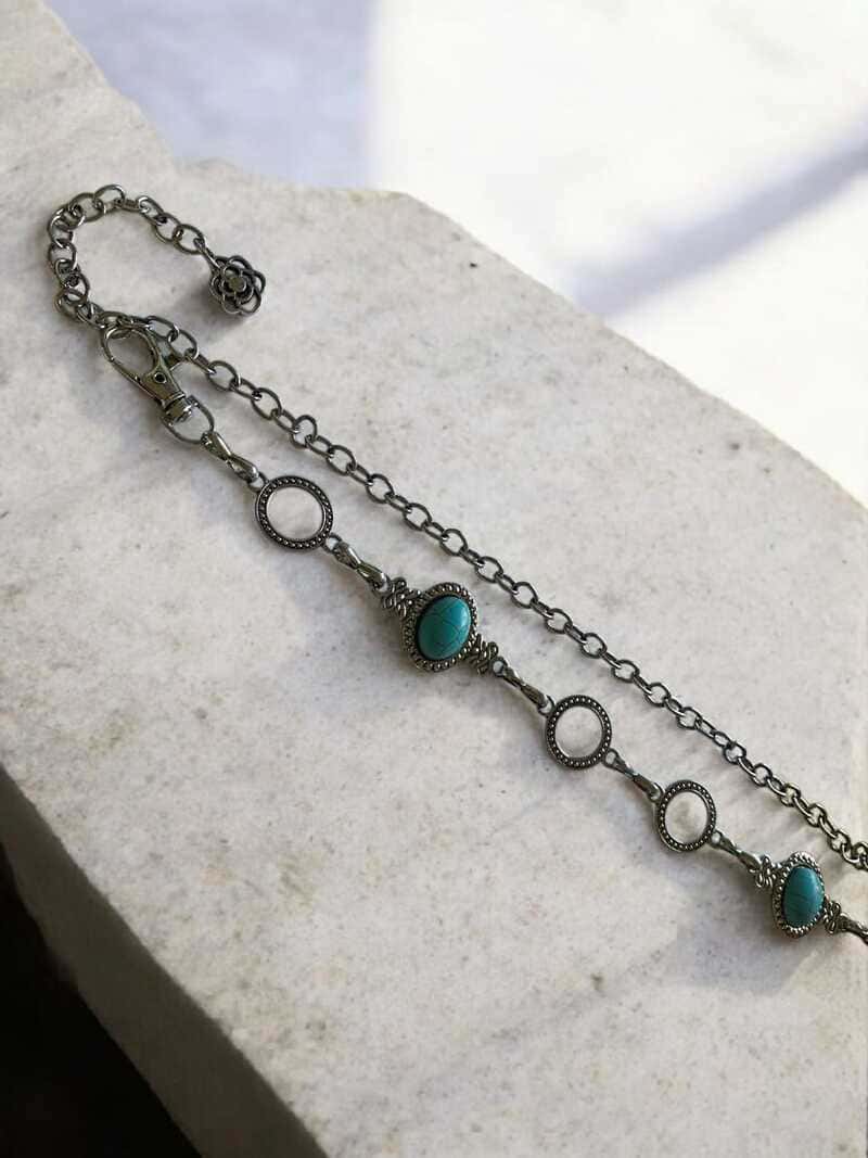 O Cinto em Metal Prateado e Esferas Azuis é uma peça statement que redefine o conceito de elegância. Seu design é uma obra de arte: as curvas do metal prateado (que remetem ao brilho da lua) são sutilmente interrompidas por esferas azuis intensas, que adicionam um ponto de cor rica e vibrante à sua silhueta.