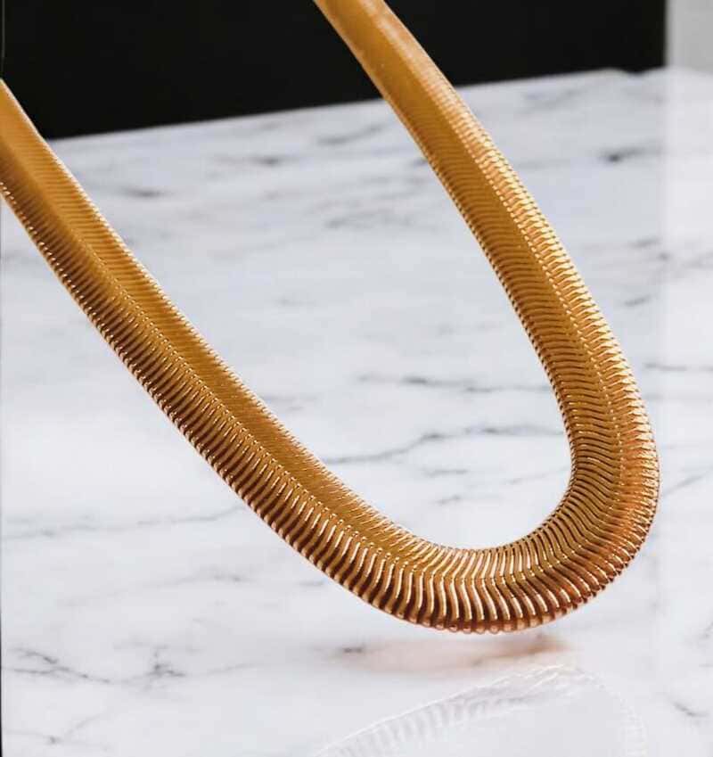 Com um design minimalista e impactante, esta peça se ajusta perfeitamente ao pescoço, deslizando com a fluidez de uma fita de seda. O acabamento laminado e polido transforma sua superfície em um espelho, refletindo a luz de forma contínua e criando o cobiçado efeito de “ouro líquido”.